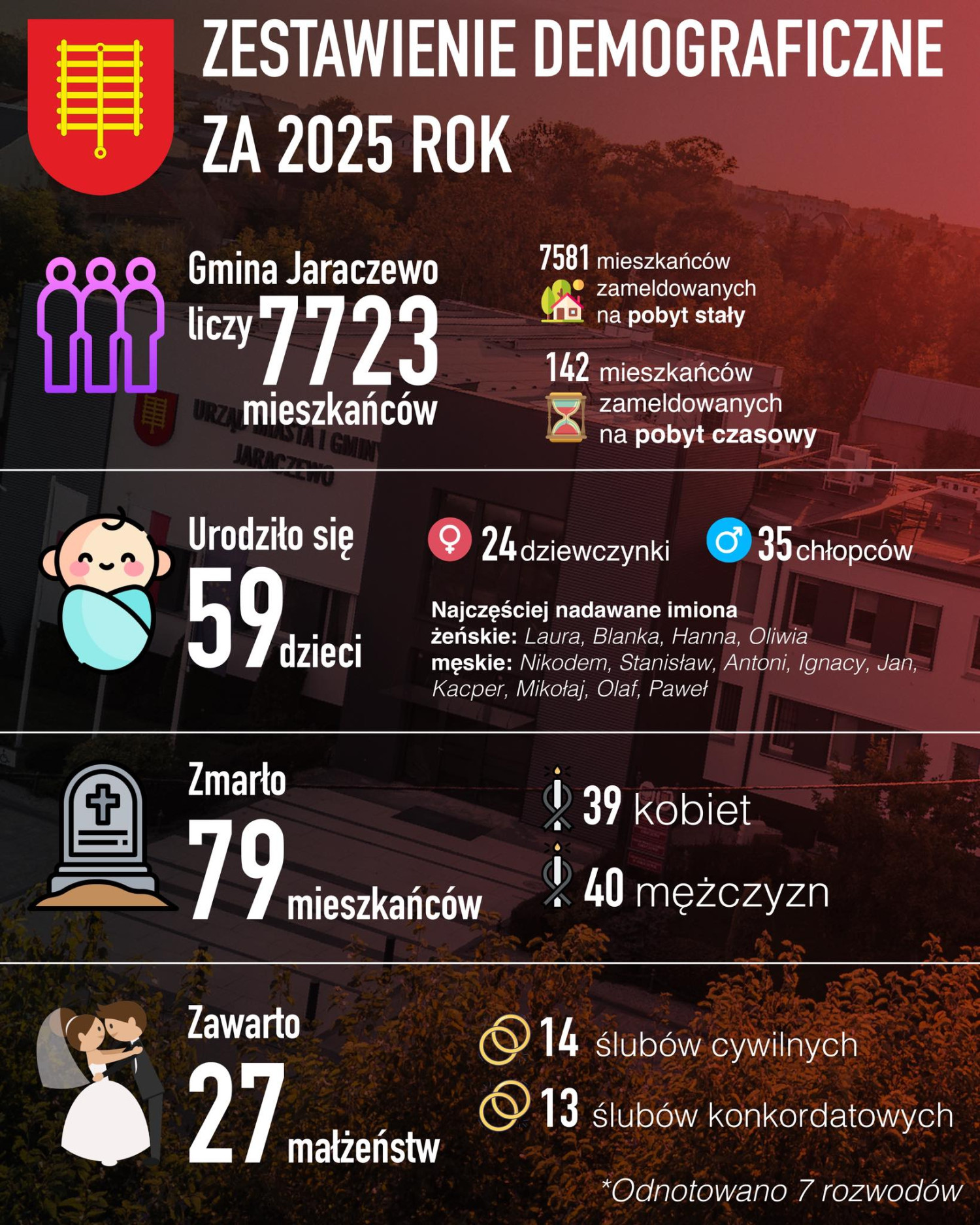 Urząd Stanu Cywilnego w Jaraczewie opublikował podsumowanie danych demograficznych za 2025 rok. Zestawienie obejmuje m.in. liczbę mieszkańców, urodzenia, zgony oraz zawarte małżeństwa. Choć najnowsze dane pokazują pewne pozytywne sygnały, jak wzrost liczby ślubów, to wciąż widoczne są wyzwania związane z ujemnym przyrostem naturalnym. Dla pełniejszego obrazu sytuacji warto zestawić je z danymi za 2024 rok, opublikowanymi wcześniej przez władze gminy.