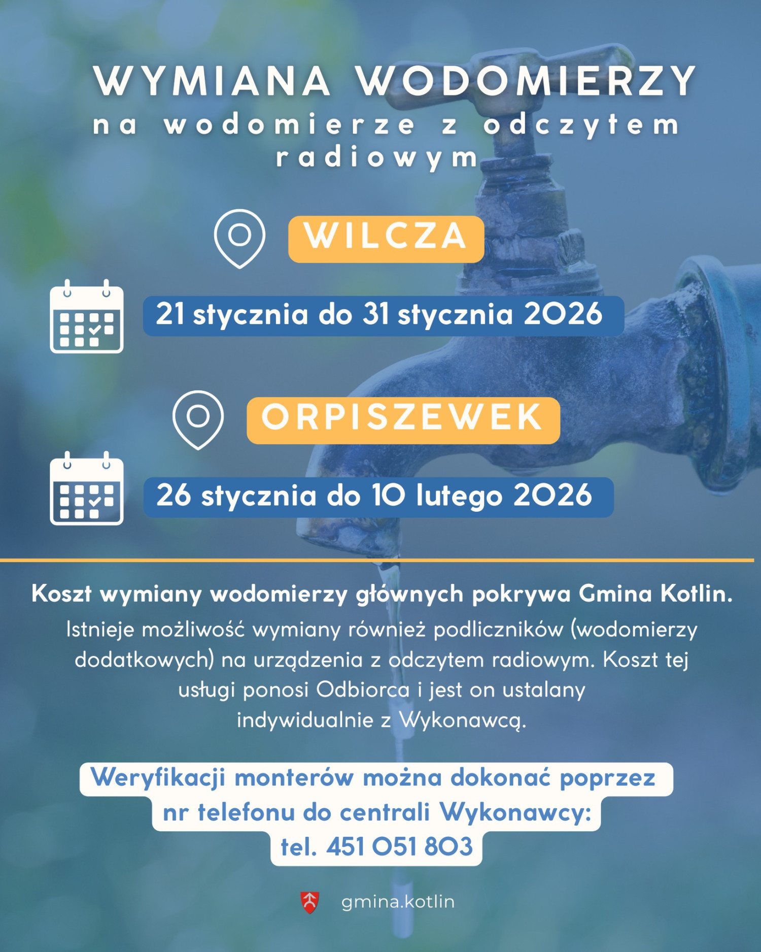 Koszt wymiany wodomierzy głównych w całości pokrywa Gmina Kotlin. Mieszkańcy proszeni są o umożliwienie pracownikom dostępu do pomieszczeń, w których zamontowane są urządzenia pomiarowe. Zadanie realizowane będzie przez firmę zewnętrzną, a osoby wykonujące prace będą posiadały odpowiednie identyfikatory oraz stosowne upoważnienia.