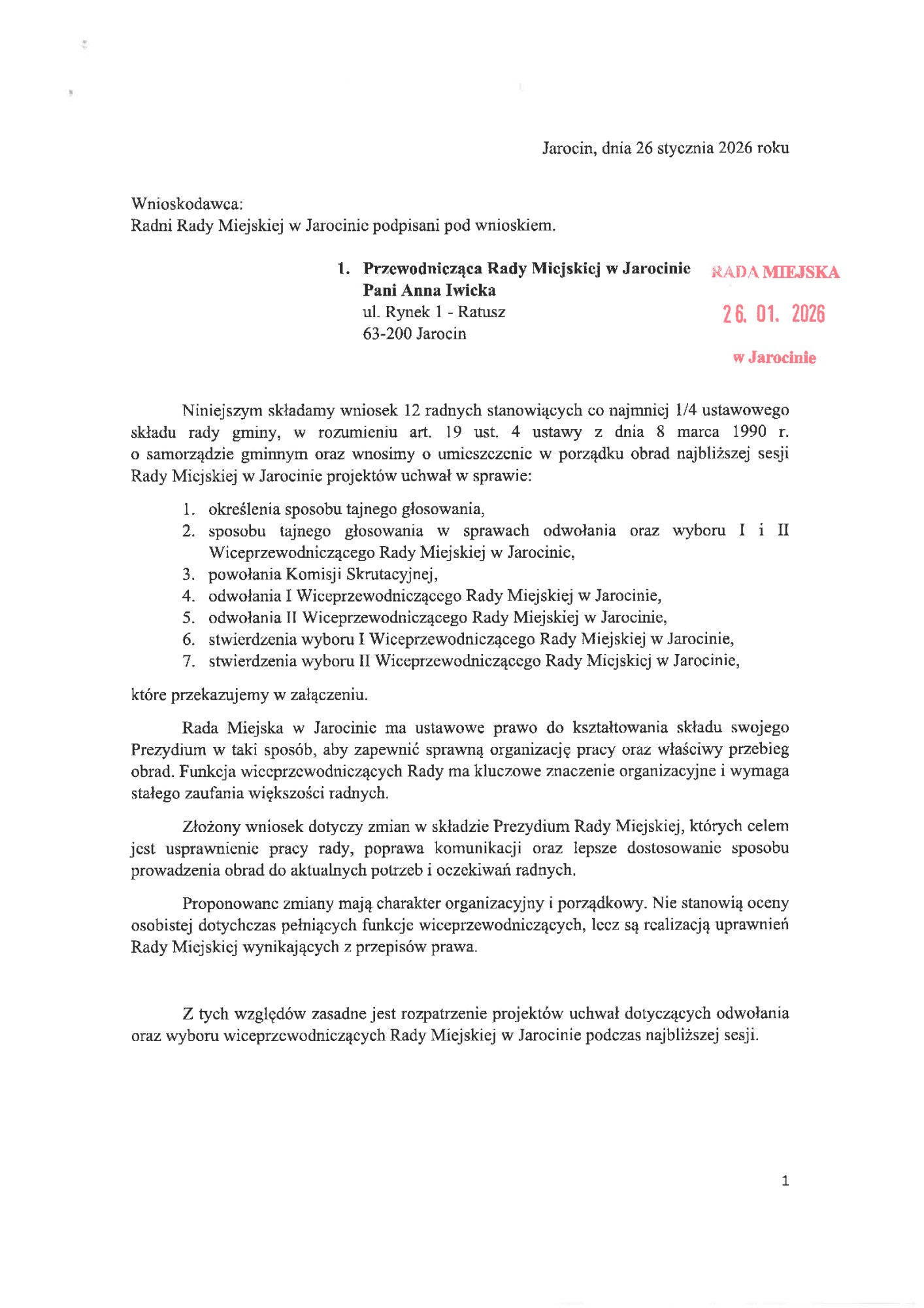 Głosowanie w sprawie odwołania Marty Zielińskiej-Zaworskiej z funkcji II wiceprzewodniczącej Rady Miejskiej w Jarocinie zakończyło się takim samym wynikiem - 12 za, 8 przeciw.