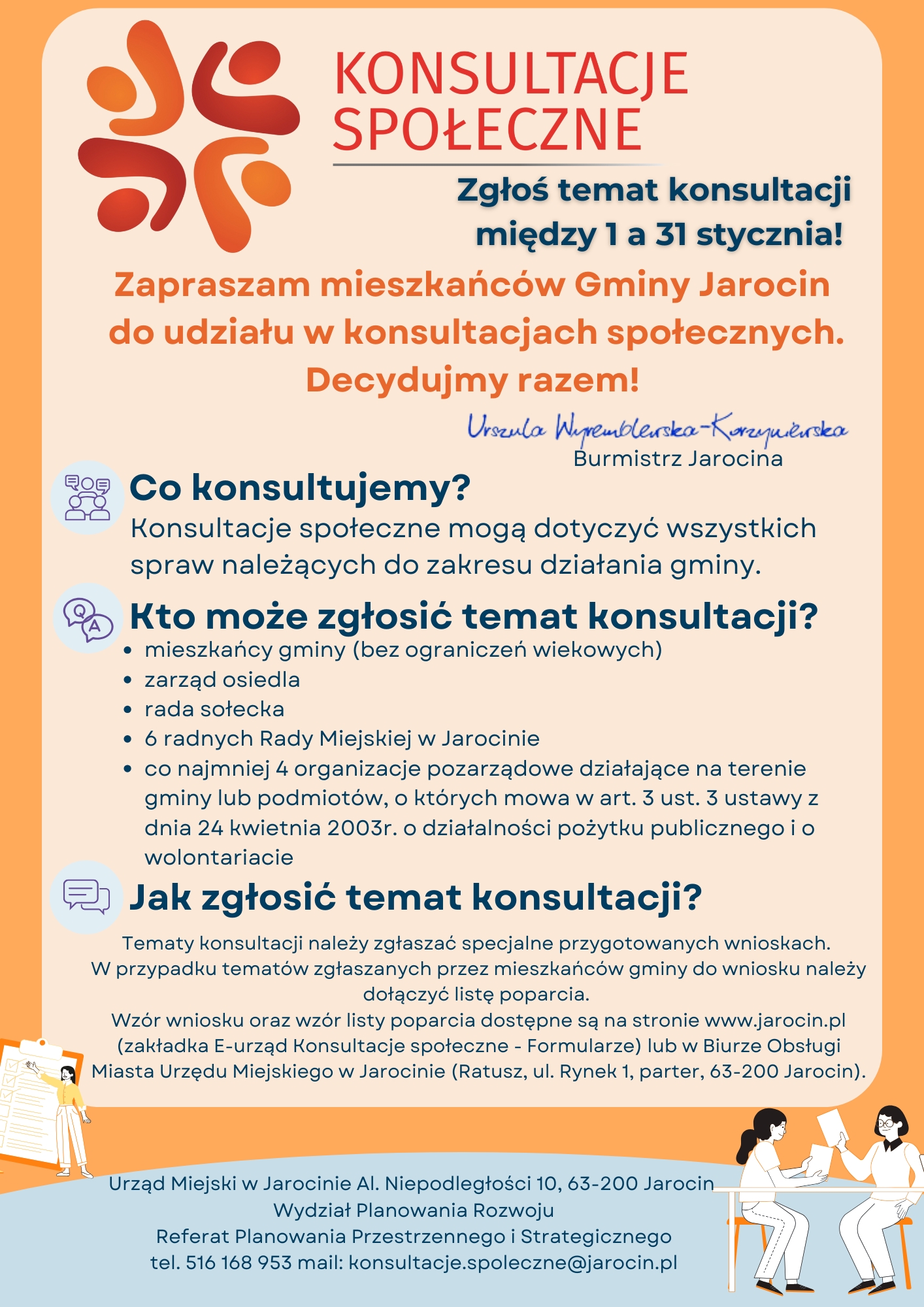 Do 31 stycznia mieszkańcy gminy Jarocin mają szansę zgłosić propozycje tematów konsultacji społecznych. Te – po rekomendacji Rady Społecznej – zostaną ujęte w Planie Konsultacji Społecznych na 2026 rok.