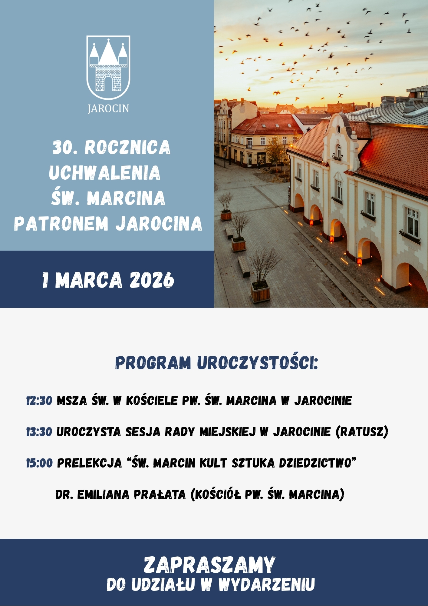 Organizatorzy serdecznie zapraszają wszystkich mieszkańców Jarocina do udziału w obchodach i wspólnego świętowania 30 lat miasta pod opieką św. Marcina – patrona, który od trzech dekad towarzyszy lokalnej społeczności w jej codziennym życiu i tradycjach.