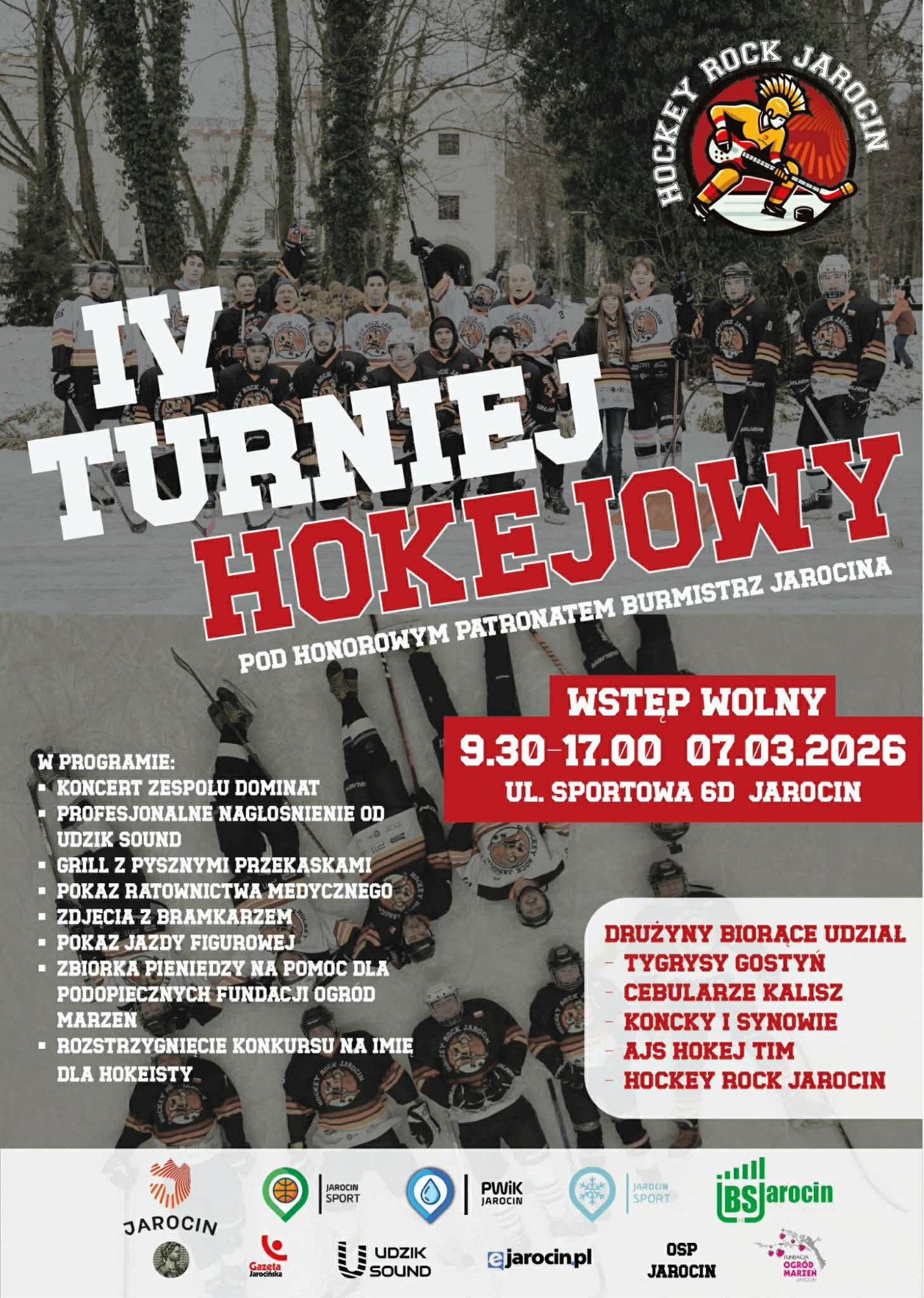 Już w sobotę 7 marca Jarocin stanie się areną sportowych emocji i dobrej zabawy. Na lodowisku przy ul. Sportowej 6D odbędzie się IV Turniej Hokejowy, organizowany przez Hockey Rock Jarocin. Wydarzenie zostanie rozegrane pod honorowym patronatem Burmistrza Jarocina oraz POD NASZYM PATRONATEM MEDIALNYM, a wstęp dla wszystkich zainteresowanych będzie całkowicie bezpłatny.