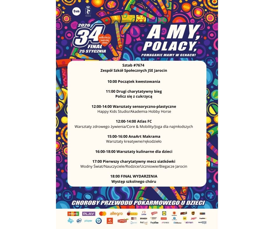 Bardzo bogaty program przygotował również sztab nr 7674 działający w Zespole Szkół Społecznych w Jarocinie. Tam finałowe granie rozpocznie się już o godz. 10:00 kwestowaniem wolontariuszy. O godz. 11:00 wystartuje 2. Charytatywny Bieg „Policz się z cukrzycą”. W ciągu dnia zaplanowano m.in. warsztaty sensoryczno-plastyczne, zajęcia zdrowego żywienia i jogę dla najmłodszych, warsztaty kreatywne i kulinarne, a także malowanie twarzy, tatuaże dla dzieci i strefę z przekąskami. O godz. 17:00 rozegrany zostanie 1. Charytatywny Mecz Siatkówki, a finałem wydarzeń będzie występ szkolnego chóru o godz. 18:00.