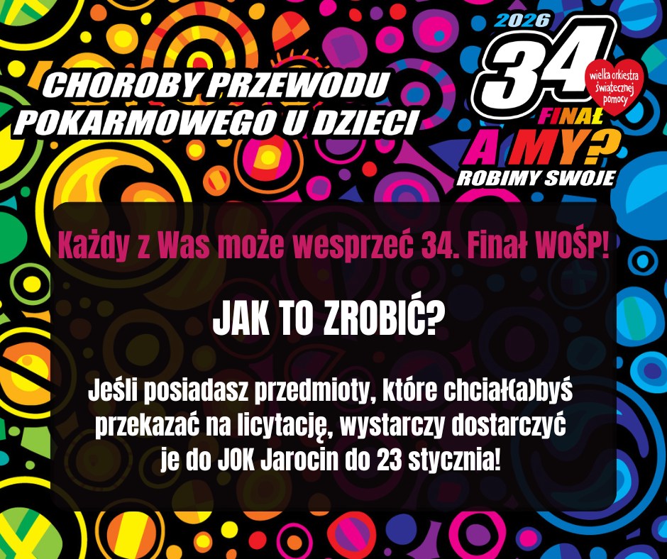 Jarocin po raz kolejny włącza się w Wielką Orkiestrę Świątecznej Pomocy. 34. Finał WOŚP odbędzie się w niedzielę, 25 stycznia 2026 roku, a na terenie miasta działać będą aż trzy sztaby: główny w JOK Jarocin, drugi w Zespole Szkół Społecznych w Jarocinie oraz trzeci w Zespole Szkół Ponadpodstawowych nr 2 w Jarocinie. Wszystkie inicjatywy połączy jeden cel – wsparcie diagnostyki i leczenia chorób przewodu pokarmowego u najmłodszych pacjentów, realizowane pod hasłem „Zdrowe brzuszki naszych dzieci”.