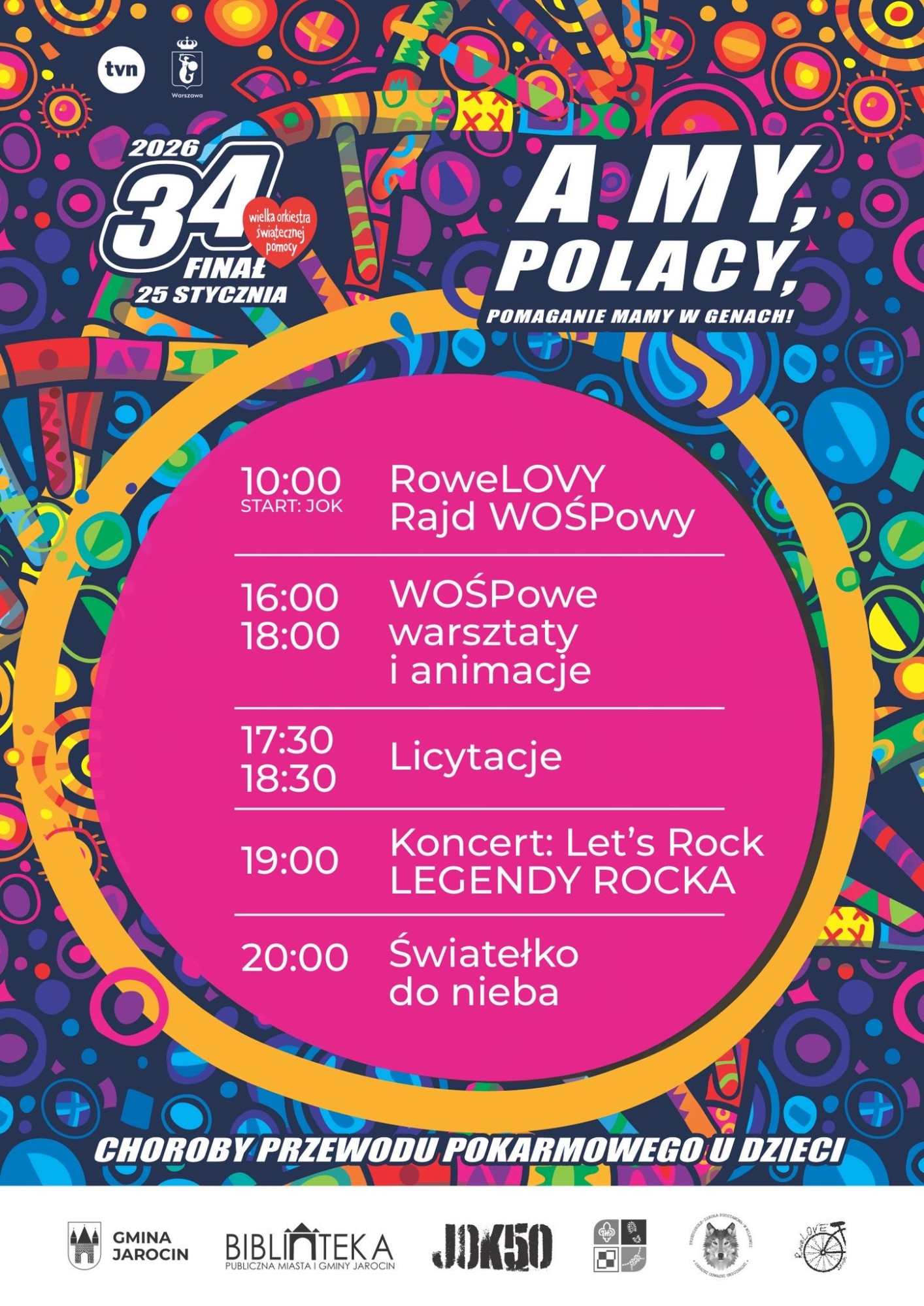 Sercem jarocińskiego finału tradycyjnie będzie JOK Jarocin, gdzie mieści się główny sztab WOŚP. To stąd o godz. 10:00 wystartuje RoweLOVY Rajd WOŚP-owy. W programie zaplanowano WOŚP-owe warsztaty i animacje dla małych i dużych (16:00–18:00), licytacje wyjątkowych gadżetów o godz. 17:30 i 18:30, a o 19:00 specjalny koncert „Let’s Rock: Legendy Rocka”. Całość zakończy się o godz. 20:00 tradycyjnym Światełkiem do Nieba. Wstęp na wydarzenia zapewnia dowolna kwota wrzucona do puszki WOŚP.
