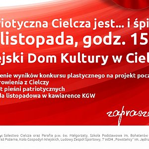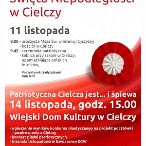 „Patriotyczna Cielcza jest… i śpiewa” to wydarzenie, które rozpocznie się o 15:00 w Wiejskim Domu Kultury w Cielczy. Będzie można posłuchać koncertu pieśni patriotycznych, a nawet samemu pośpiewać podczas biesiady listopadowej, przygotowanej w okolicznościowej kawiarence przez miejscowe KGW. Podczas uroczystości ogłoszone zostaną także wyniki konkursu plastycznego na projekt pocztówki i pozdrowienia z Cielczy.