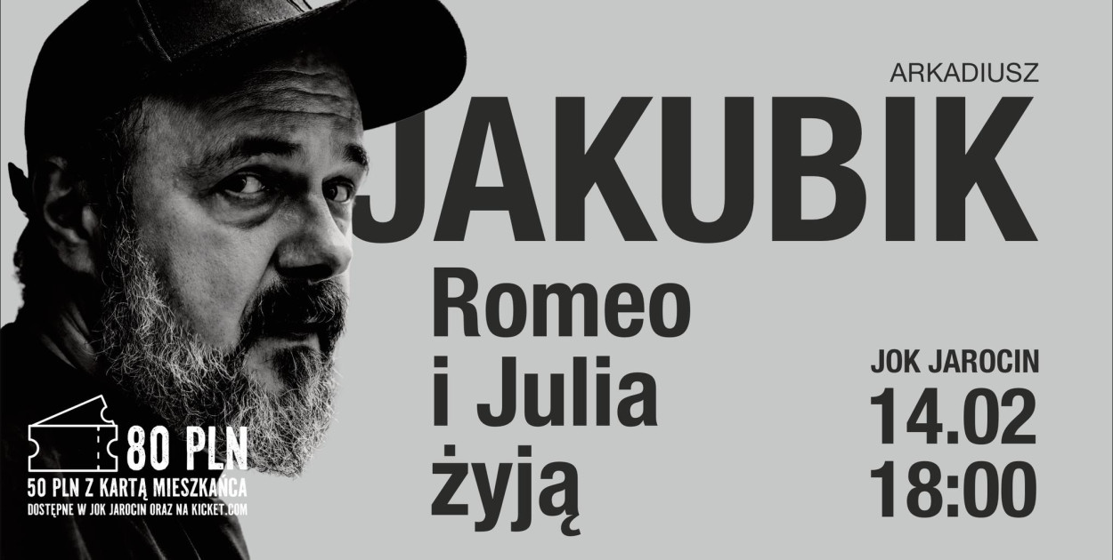 14 lutego o godzinie 18:00, w JOK Jarocin wystąpi Arkadiusz Jakubik ze swoim autorskim projektem „Romeo i Julia żyją”. To oryginalne połączenie spektaklu, muzycznego performansu, filmu i koncertu. Artyście na scenie towarzyszą muzycy, którzy – poza grą – wcielają się również w role aktorskie. Prosta inscenizacja, muzyka na żywo, interakcja z publicznością oraz projekcje video-artów Natana Berkowicza tworzą wielowymiarowe widowisko. W warstwie fabularnej jest to melodramatyczno-komediowa opowieść o miłości Romea i Julii po czterdziestce, osadzona w realiach małego miasteczka i zakończona happy endem. Bilety.