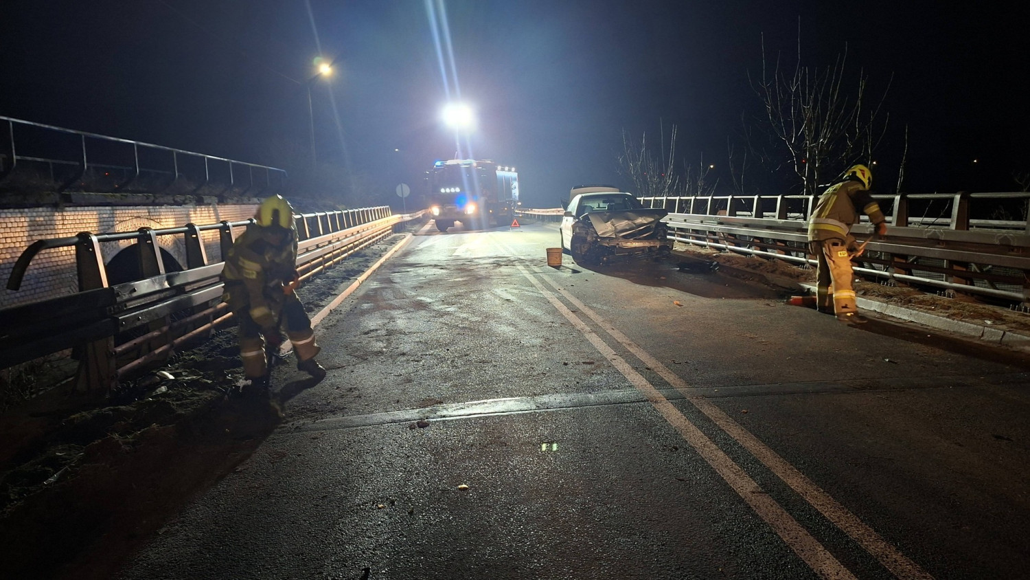 Strażacy uprzątnęli z jezdni elementy nadwozia, które odpadły w wyniku uderzenia, a także usunęli rozlane płyny eksploatacyjne, aby nie stwarzały zagrożenia dla innych uczestników ruchu.