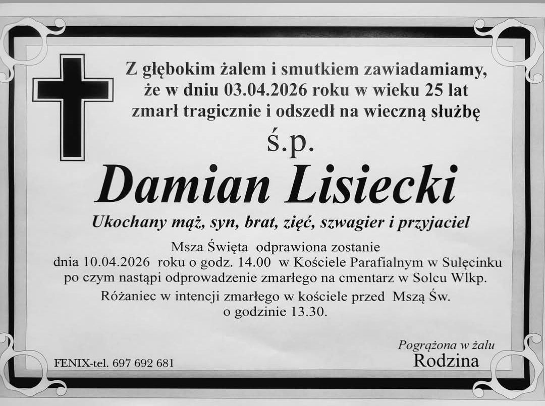 - Z ogromnym smutkiem i niedowierzaniem przyjęliśmy wiadomość o śmierci dh. Damiana Lisieckiego (…) Odszedł człowiek, który całe swoje życie poświęcił służbie drugiemu człowiekowi – napisali druhowie z OSP Sulęcinek w mediach społecznościowych, podkreślając jego zaangażowanie, odwagę i oddanie.