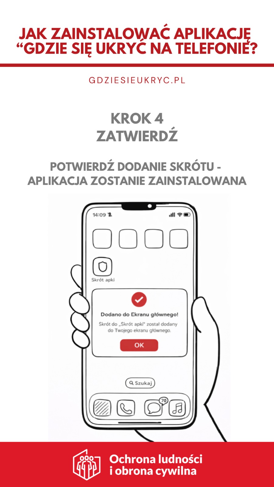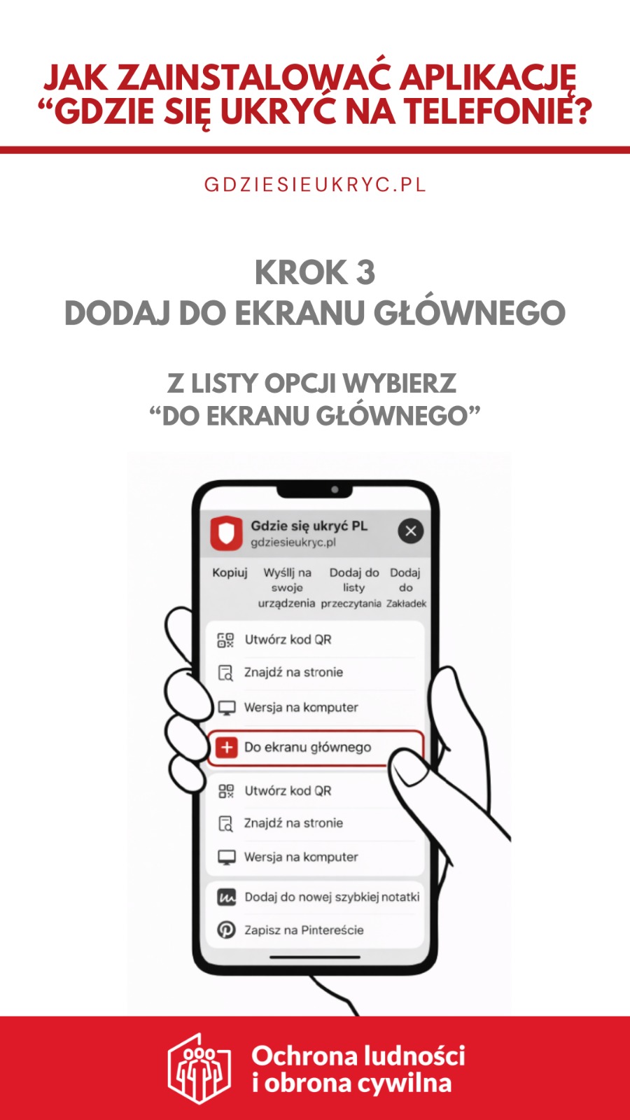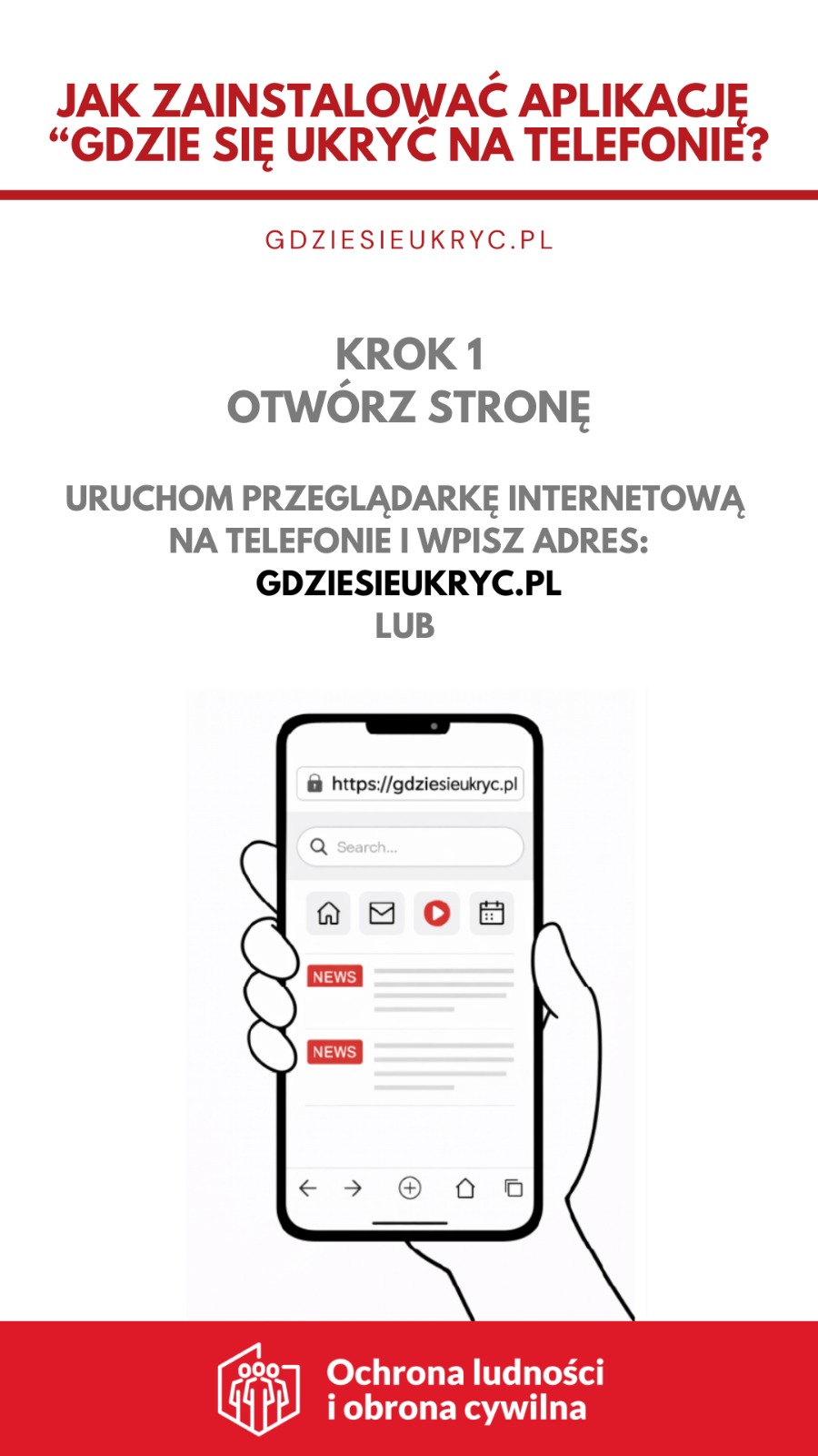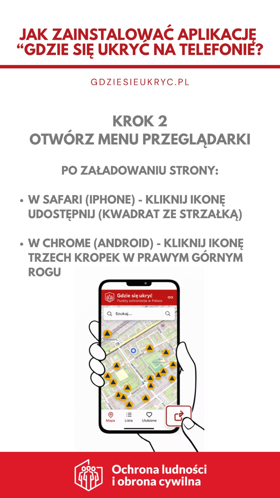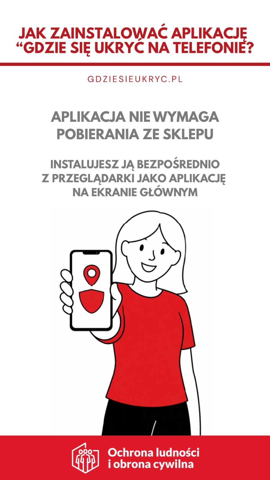 „Gdzie się ukryć” to nowoczesne i przyjazne narzędzie, które może posiadać każdy obywatel. Zostało zaprojektowana z myślą o prostocie i skuteczności: wystarczy telefon komórkowy typu smartfon, by w sytuacji nagłego zagrożenia – np. bardzo silnego wiatru czy potencjalnego zagrożenia środkami napadu powietrznego – szybko odnaleźć najbliższe Punkty Schronienia (PS) oraz uruchomić nawigację na mapie. Co ważne, po wcześniejszym pobraniu danych aplikacja działa również w trybie offline.