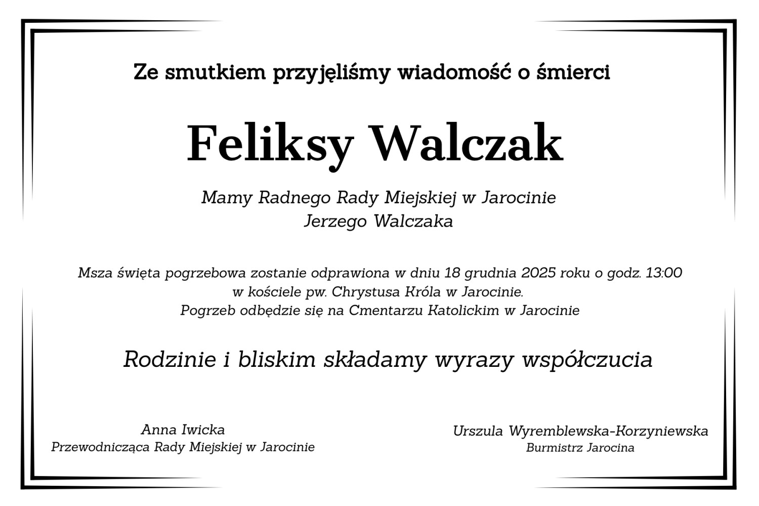 - Ze smutkiem przyjęliśmy wiadomość o śmierci Feliksy Walczak. Rodzinie i bliskim składamy wyrazy współczucia – napisały Anna Iwicka, przewodnicząca Rady Miejskiej w Jarocinie, oraz Urszula Wyremblewska-Korzyniewska, burmistrzyni Jarocina.