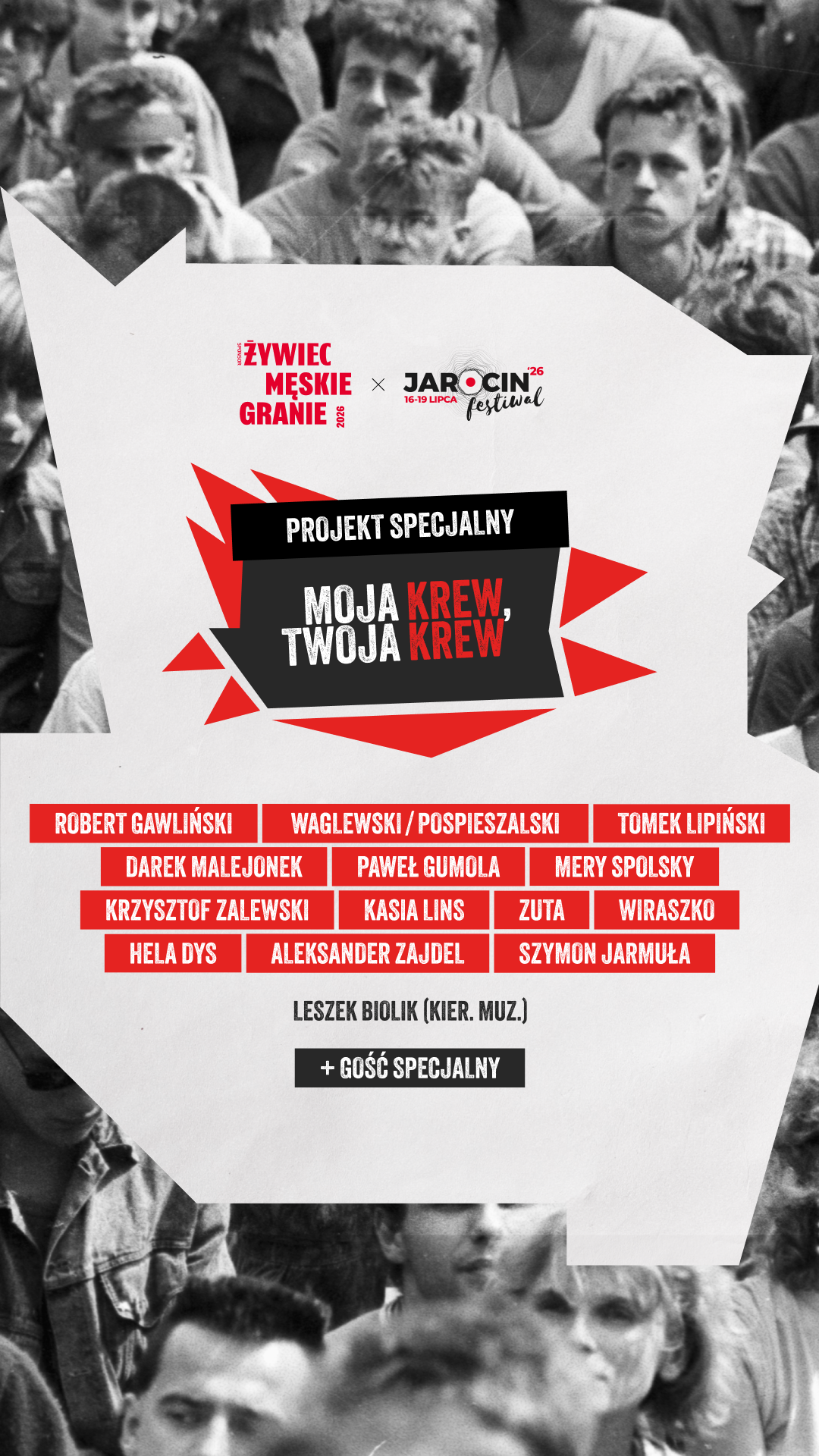 Podczas koncertów „Moja krew, Twoja krew” na Jarocin Festiwal 2026 oraz Żywiec Męskie Granie 2026, wystąpią: Robert Gawliński, Tomek Lipiński, Wojciech Waglewski, Darek Malejonek, Paweł Gumola, Mateusz Pospieszalski, Krzysztof Zalewski (Jarocin Festiwal + 21.08 Męskie Granie Warszawa), Mery Spolsky, Kasia Lins (tylko Jarocin Festiwal), Michał Wiraszko, Zuta, Hela Dys, Aleksander Zajdel, Szymon Jarmuła.